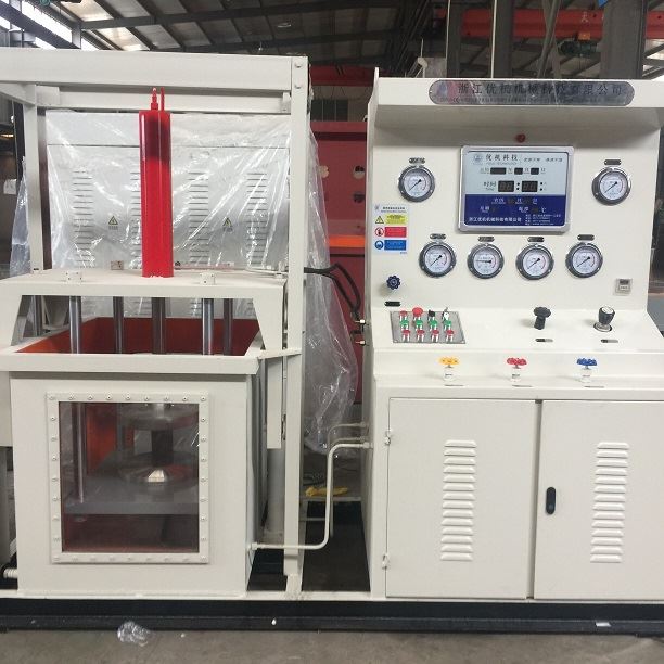 采用了卸荷保壓回路設(shè)計。有效地控制了連續(xù)開機條件下液壓油的溫升,節(jié) 省了試驗過程的能耗并提高了液壓密封元件(進口聚氨酯)的壽命。液壓站與主機在結(jié)構(gòu)上連接在一起(管路刷洗鍍鋅處理),結(jié)構(gòu)緊湊。試驗所需液壓系統(tǒng)的壓力可通過操作控制臺上的遠程調(diào)壓閥配合增壓系統(tǒng)來設(shè)定。所有試驗中執(zhí)行機構(gòu)的動作操縱和加壓介質(zhì)的控制均可在 操作面板上通過按鈕(施耐德)和閥門(特制高壓閥)組來實現(xiàn)。設(shè)計參數(shù)保證了動作執(zhí)行的靈敏度和位置精確性。液壓控制系統(tǒng)的零部件均采用“上海華島液壓件,油泵電機采用(西門子電機)